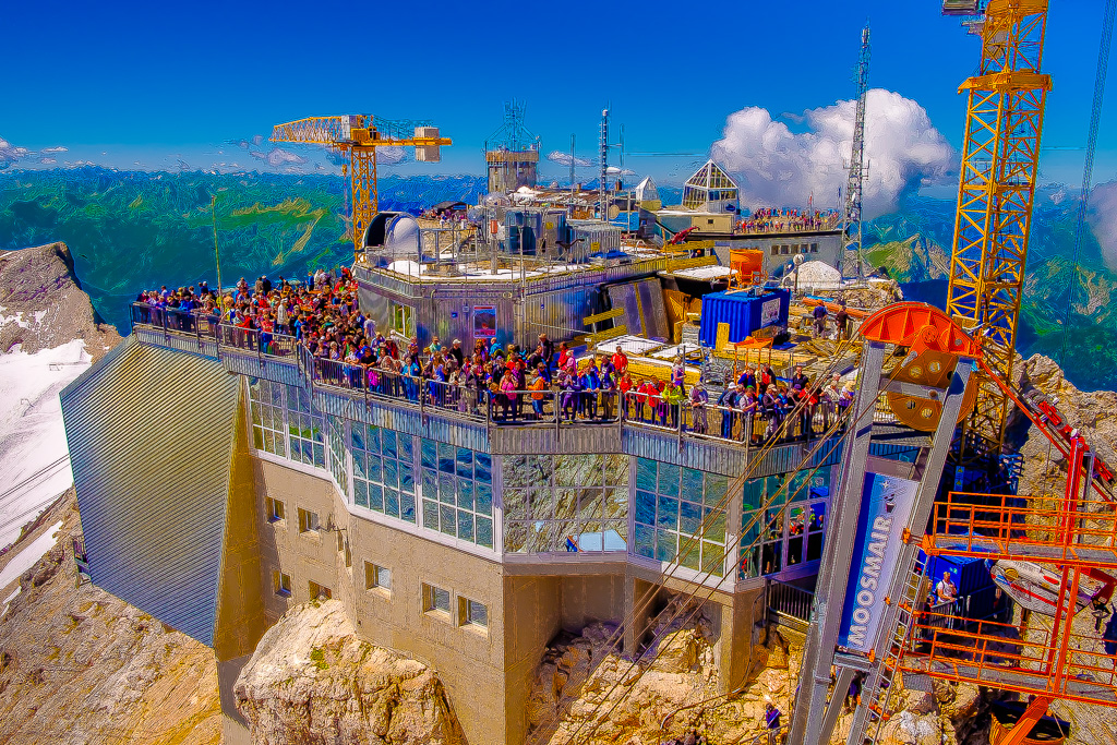 “Top of Germany” ist der Slogan der Bayerische Zugspitzbahn Bergbahn AG. Das Bild zeigt die Zugspitze, den höchsten Berg Deutschlands. Oder genauer: es zeigt ihn nicht, denn der Berg ist unter einem absurden Auswuchs des Alpentourismus verschwunden. Allseitig durch Betonstreben abgestützt, ragt die vierstöckige Besucherplattform über den natürlichen Fels hinaus. Und sie wird noch fleißig erweitert. Bayern und Tiroler bauen um die Wette. Ein ästhetischer und ökologischer Totalschaden.